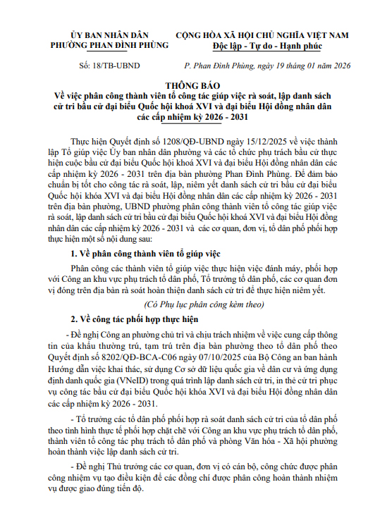 Thông báo về việc phân công thành viên tổ công tác giúp việc rà soát, lập danh sách cử tri bầu cử đại biểu Quốc hội khoá XVI và đại biểu Hội đồng nhân dân các cấp nhiệm kỳ 2026 - 2031