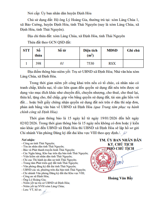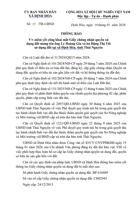 Thông báo về việc niêm yết công khai mất Giấy chứng nhận quyền sử dụng đất mang tên ông Lý Hoàng Gia và bà Đặng Thị Tới sử dụng đất tại xã Định Hóa, tỉnh Thái Nguyên
