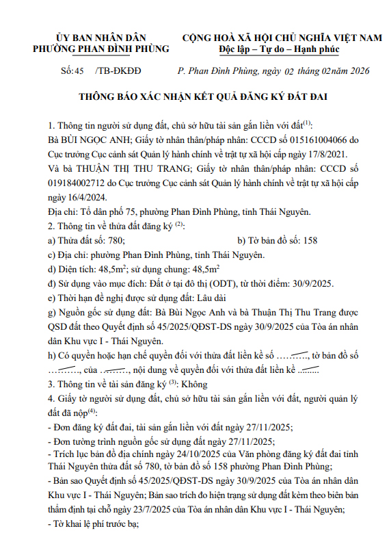 THÔNG BÁO XÁC NHẬN KẾT QUẢ ĐĂNG KÝ ĐẤT ĐAI bà Bùi Ngọc Anh và bà Thuận Thị Thu Trang