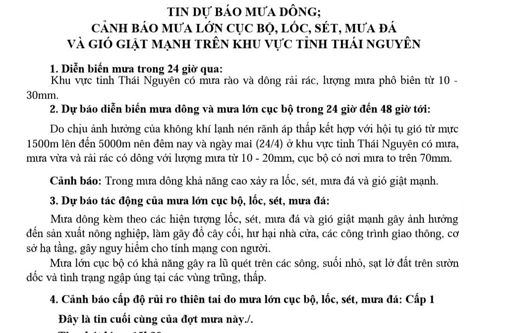 TIN DỰ BÁO MƯA DÔNG; CẢNH BÁO MƯA LỚN CỤC BỘ, LỐC, SÉT, MƯA ĐÁ VÀ GIÓ GIẬT MẠNH TRÊN KHU VỰC TỈNH THÁI NGUYÊN