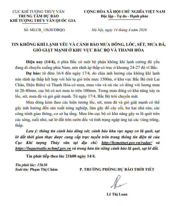 TIN KHÔNG KHÍ LẠNH YẾU VÀ CẢNH BÁO MƯA DÔNG, LỐC, SÉT, MƯA ĐÁ, GIÓ GIẬT MẠNH Ở KHU VỰC BẮC BỘ VÀ THANH HÓA