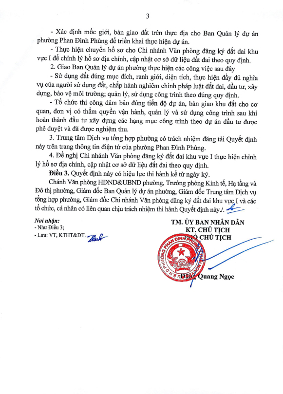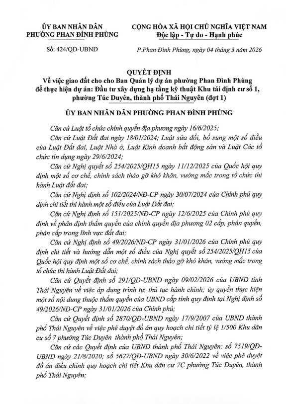Về việc giao đất cho cho Ban Quản lý dự án phường Phan Đình Phùng để thực hiện dự án: Đầu tư xây dựng hạ tầng kỹ thuật Khu tái định cư số 1, phường Túc Duyên, thành phố Thái Nguyên (đợt 1)