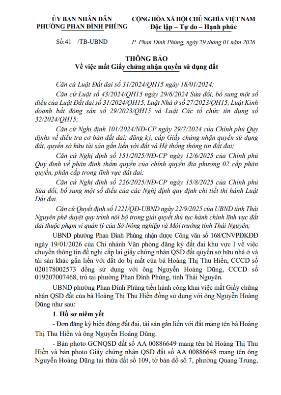 Về việc mất Giấy chứng nhận quyền sử dụng đất bà Hoàng Thị Thu Hiền đồng sử dụng với ông Nguyễn Hoàng Dũng