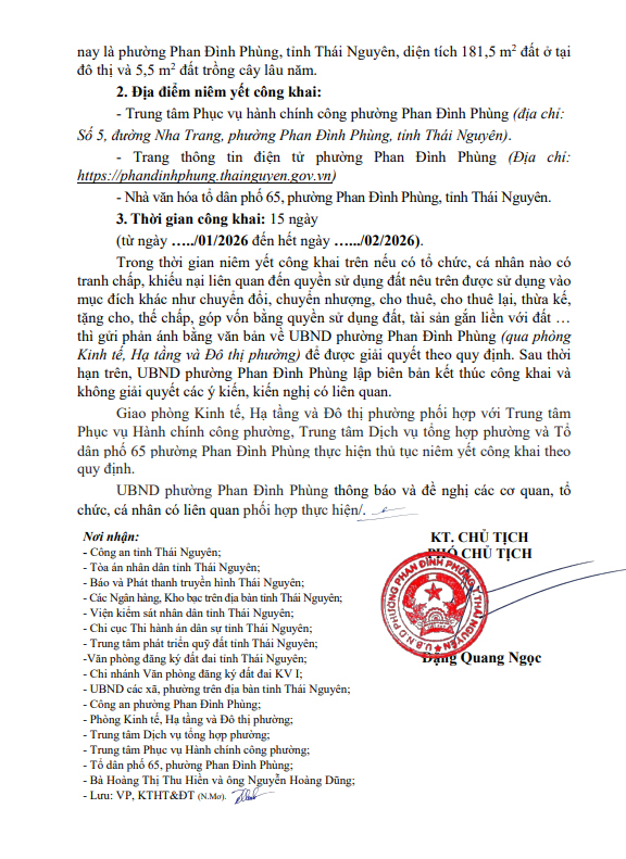 Thông báo về việc tháo dỡ, di chuyển tài sản trên khu đất thu hồi của công ty Cổ phần Trung Tín, phường Phan Đình Phùng, tỉnh Thái Nguyên