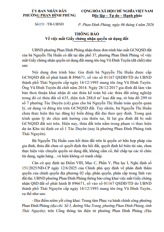 Về việc mất Giấy chứng nhận quyền sử dụng đất của bà Nguyễn Thị Huấn (sử dụng đất tại phường Túc Duyên nay là phường Phan Đình Phùng)