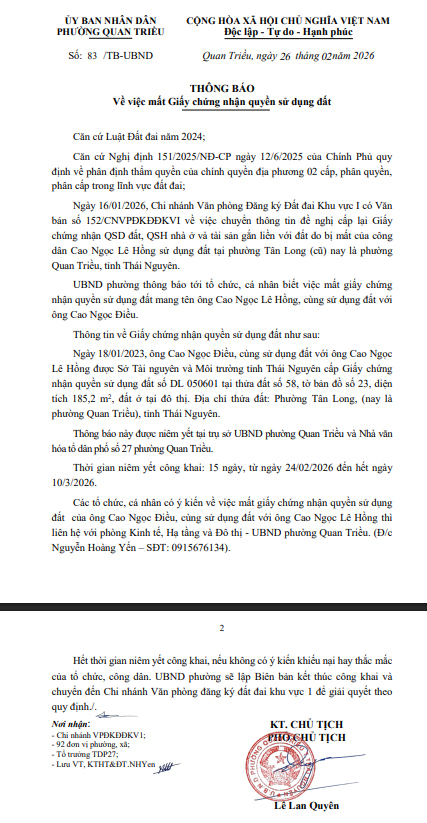 Về việc mất Giấy chứng nhận quyền sử dụng đất của ông Cao Ngọc Điều, p.Tân Long (P.Quan Triều)