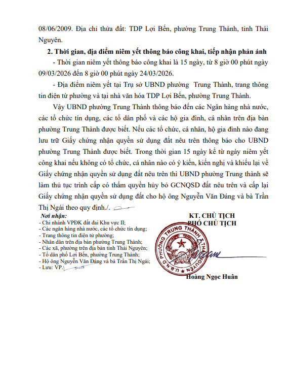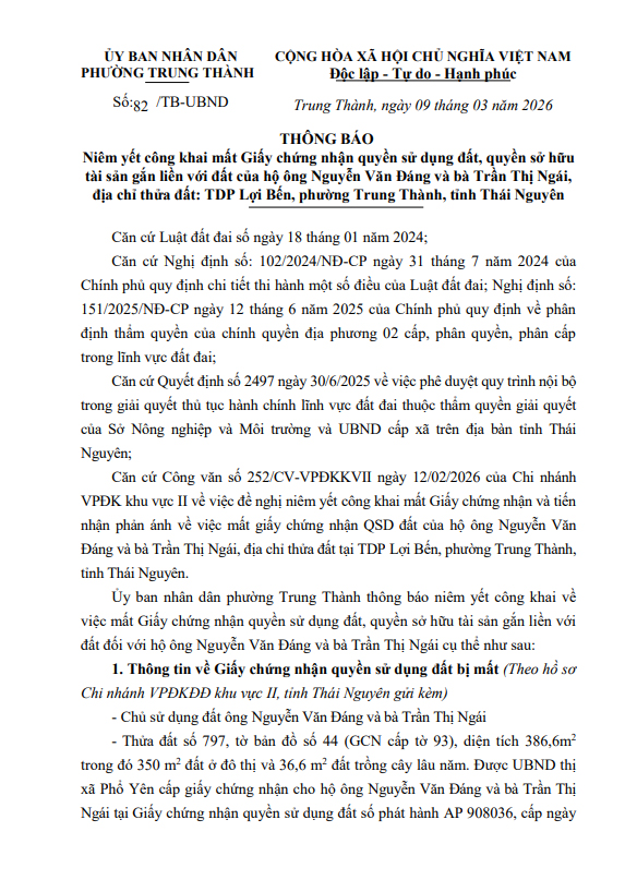 Về việc niêm yết công khai mất Giấy chứng nhận quyền sử dụng đất, quyền sở hữu tài sản gắn liền với đất của hộ ông Nguyễn Văn Đáng và bà Trần Thị Ngái