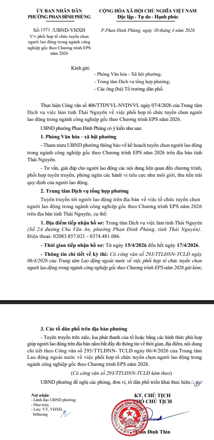 V/v phối hợp tổ chức tuyển chọn người lao động trong ngành công nghiệp gốc theo Chương trình EPS năm 2026