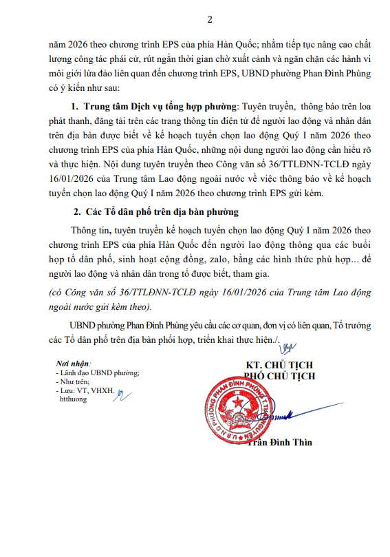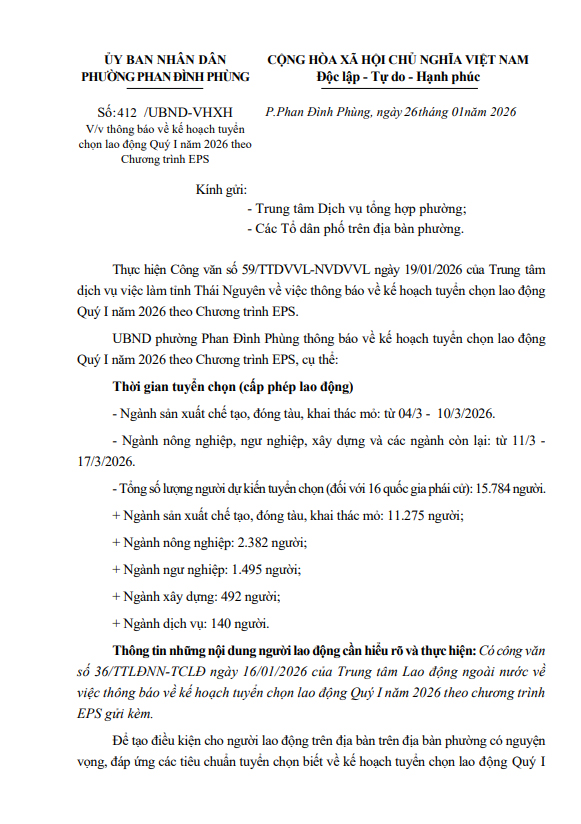 V/v thông báo về kế hoạch tuyển chọn lao động Quý I năm 2026 theo Chương trình EPS