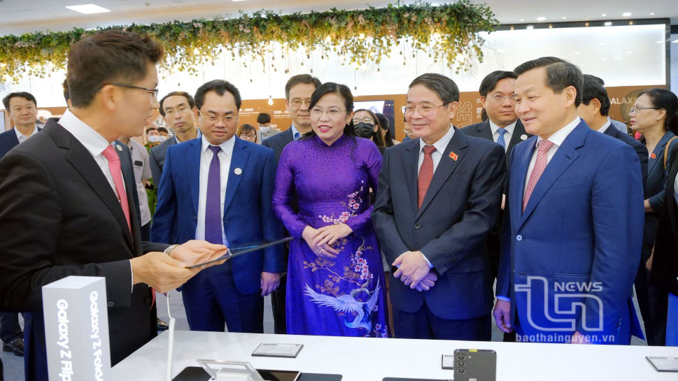 Các đồng chí lãnh đạo Đảng, Nhà nước và lãnh đạo tỉnh tham quan sản phẩm công nghệ của Công ty TNHH Samsung Electronics Việt Nam - Thái Nguyên.
