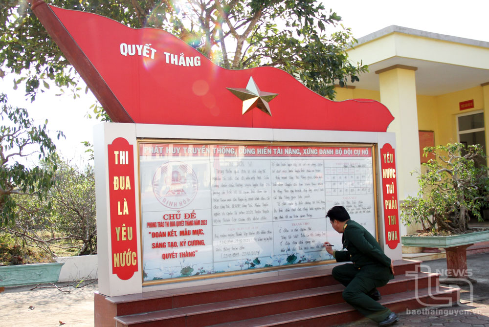 Cán bộ Ban CHQS huyện Định Hóa cập nhật thông tin trên bảng tin của đơn vị.